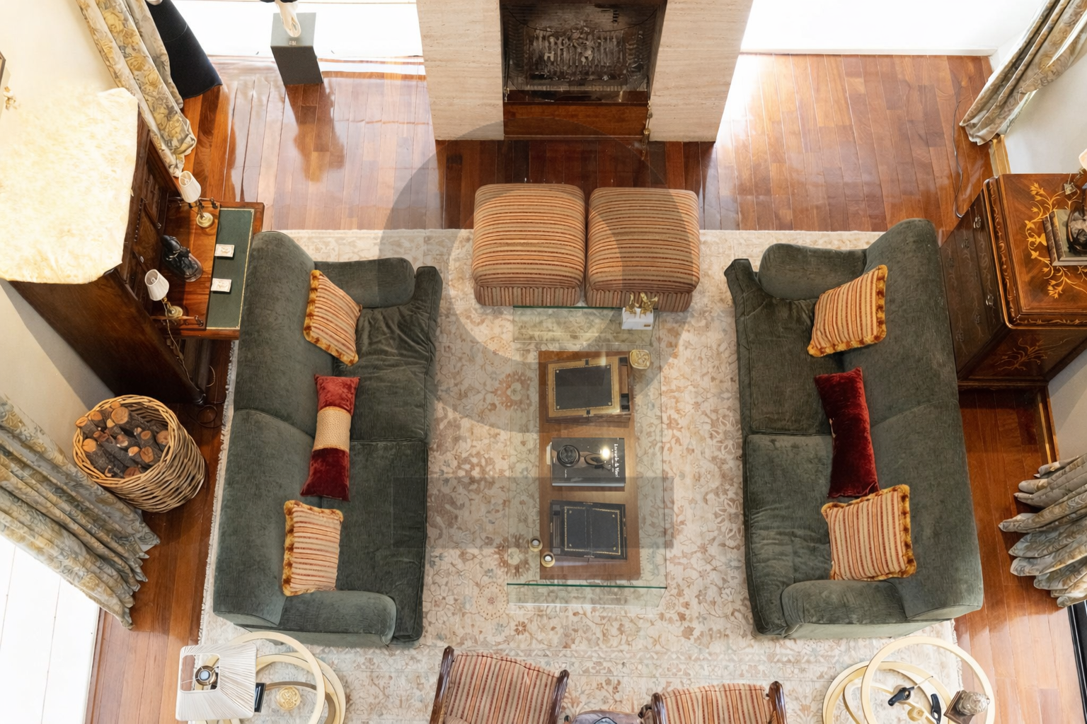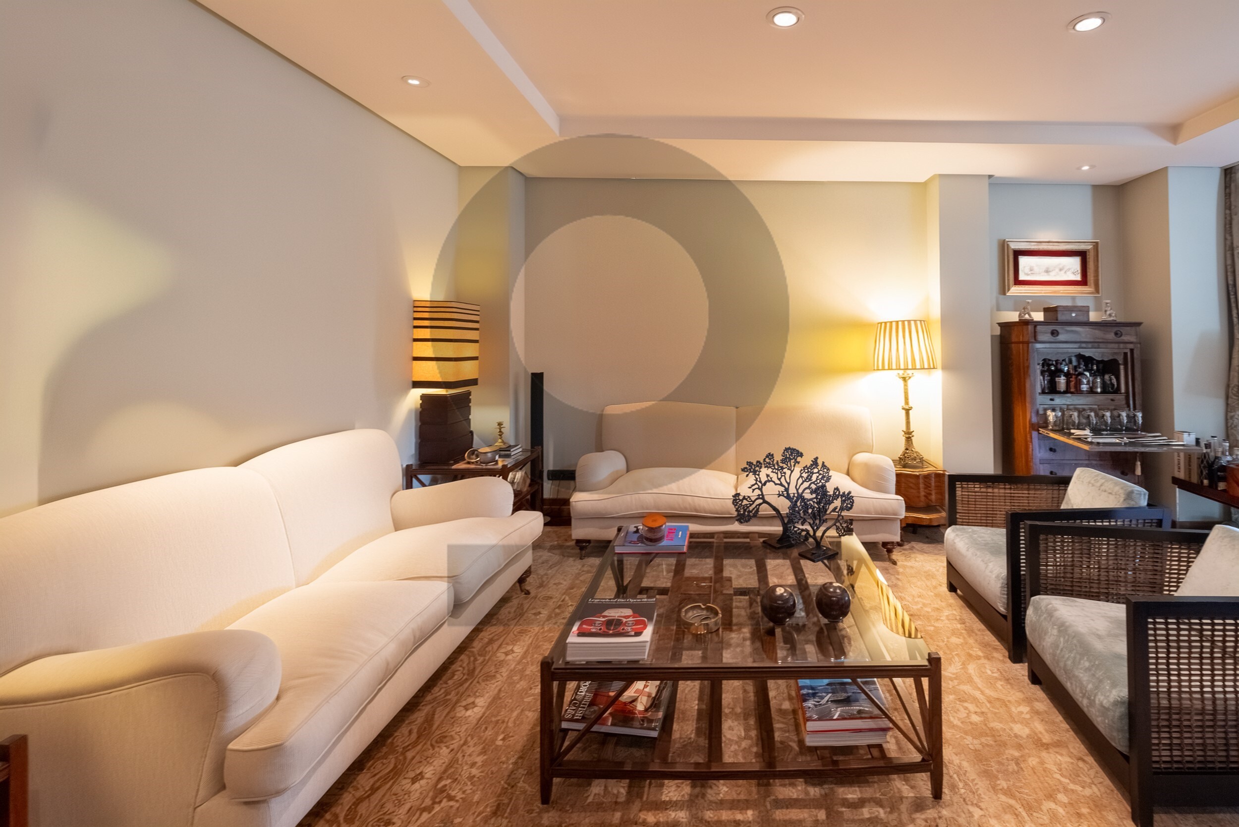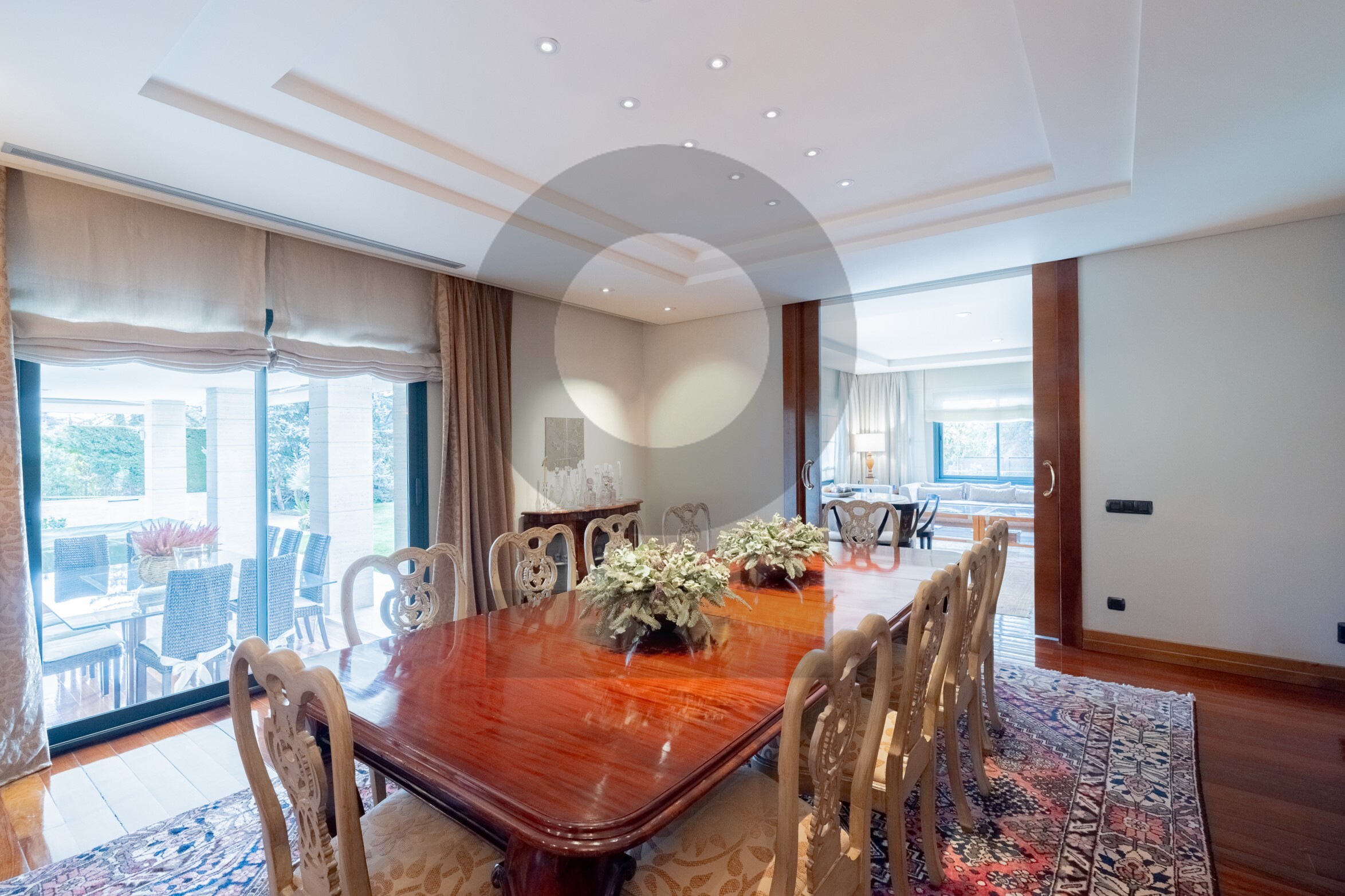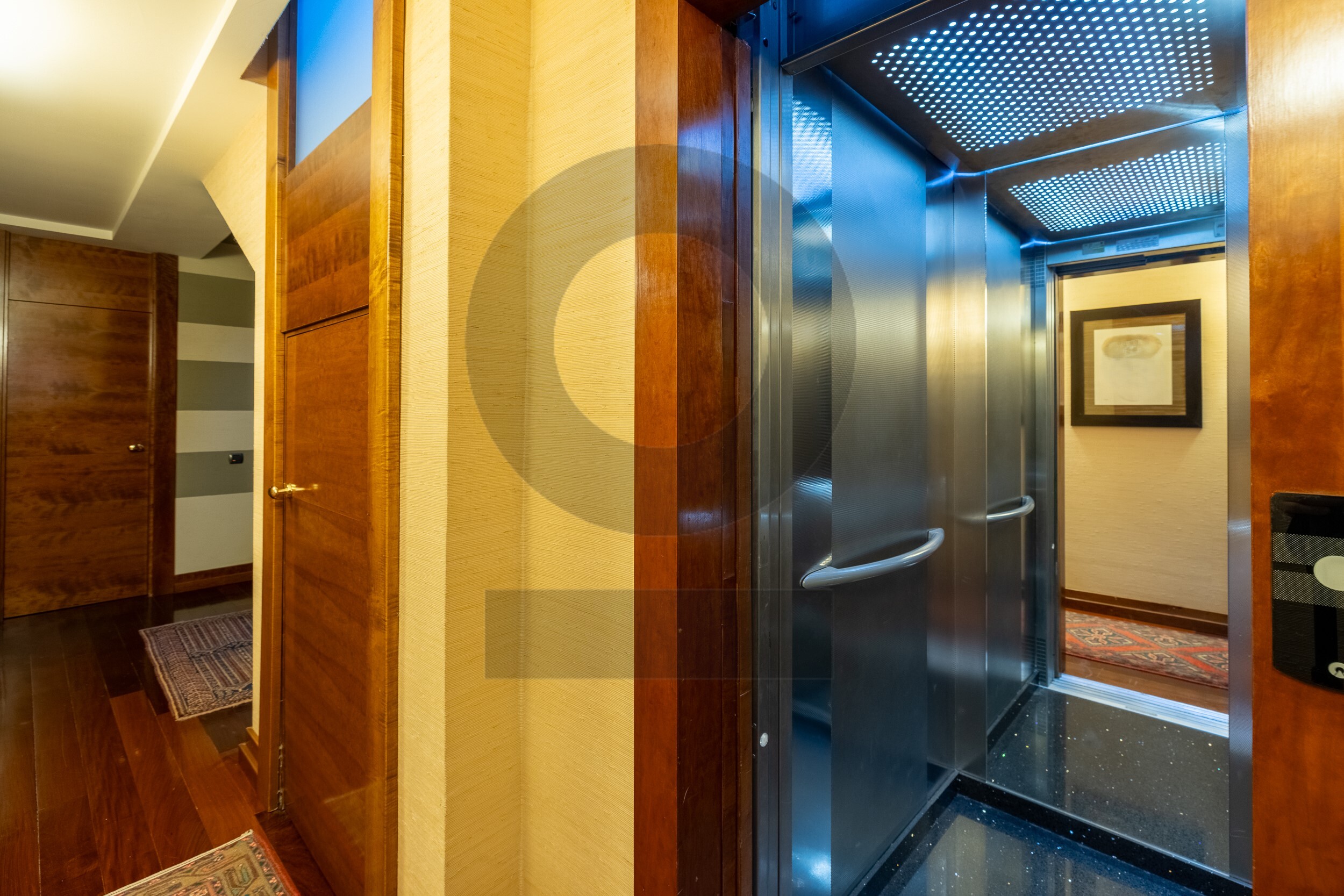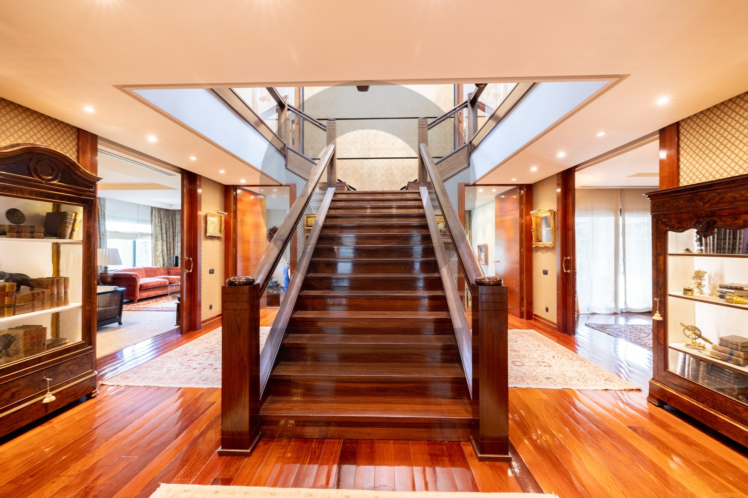 En la planta baja se sitúa un elegante hall distribuidor que da acceso al salón principal, una biblioteca, el comedor y sala de estar. La vivienda dispone de dos zonas de cocina, además de lavandería independiente y patio. En esta planta se encuentran también 5 dormitorios con baño en suite y un aseo de cortesía, todo ello comunicado por ascensor.